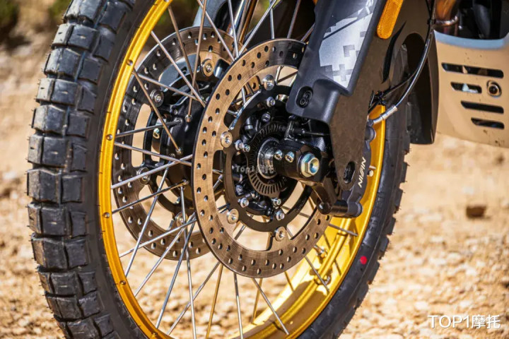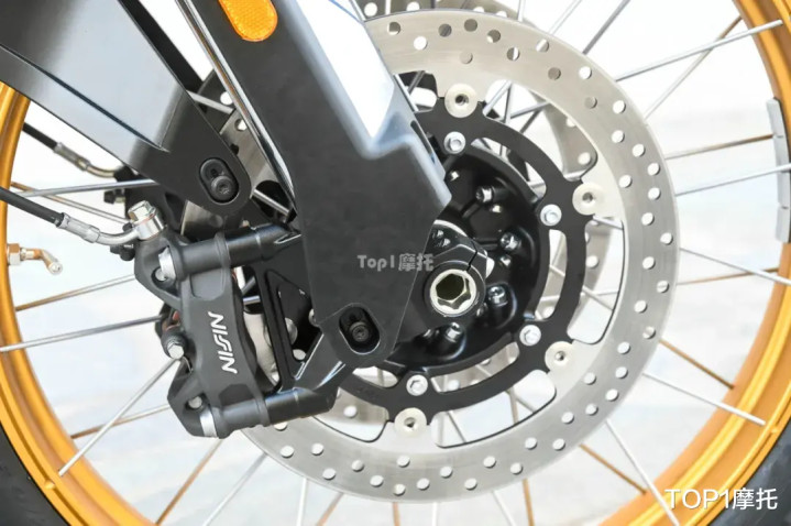 制动系统由Nissin提供,前刹车采用双298mm碟刹盘+Nissin四活塞径向刹车卡钳,后刹车采用240mm碟刹盘+Nissin单活塞刹车卡钳,标配双通道ABS和TCS,ABS和TCS均支持一键关闭,方便越野骑行。