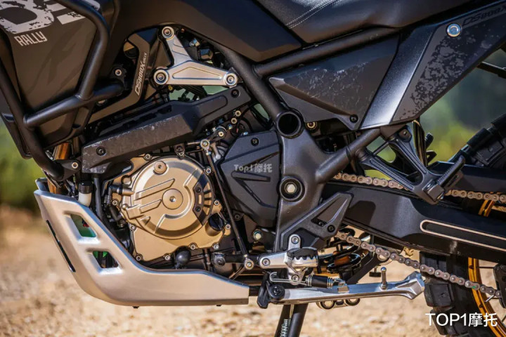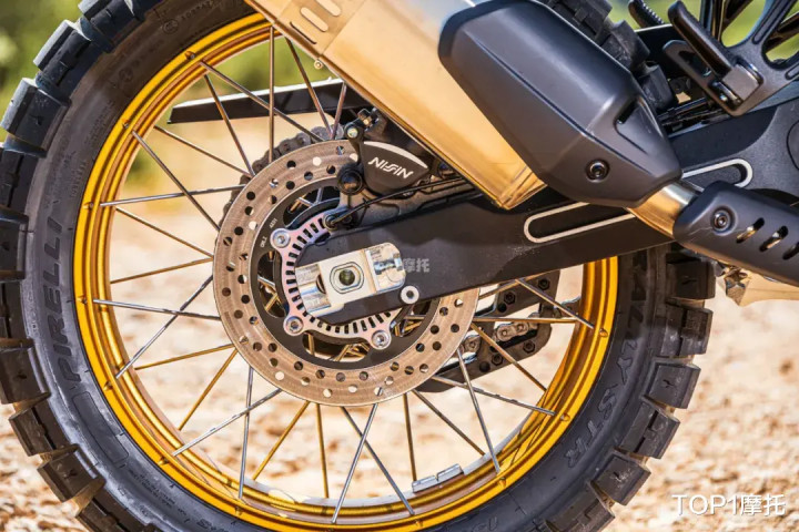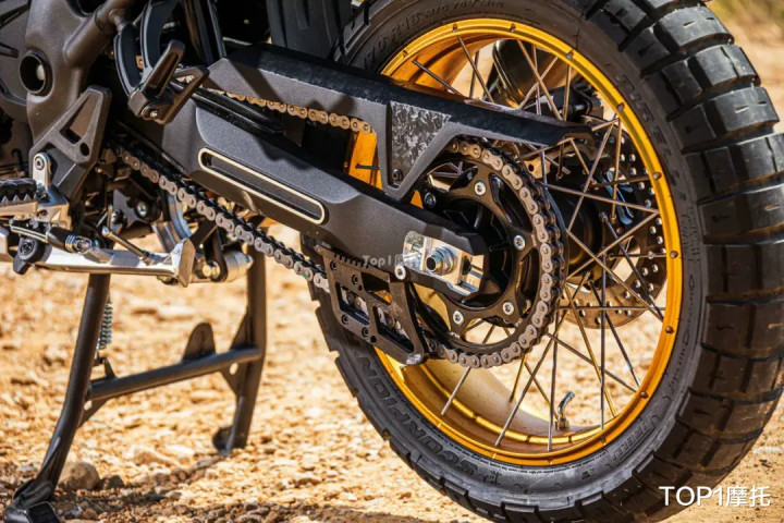 前后辐条轮毂分别为21英寸和18英寸,搭配倍耐力Scorpion Rally STR无内胎轮胎,轮胎宽度是前90后180,显然也是更偏向越野骑行的轮胎。因为减震长、轮胎大,所以无极DS800X的离地间隙达到了220mm,搭配全金属的发动机下护板,进一步提升了该车的通过性。