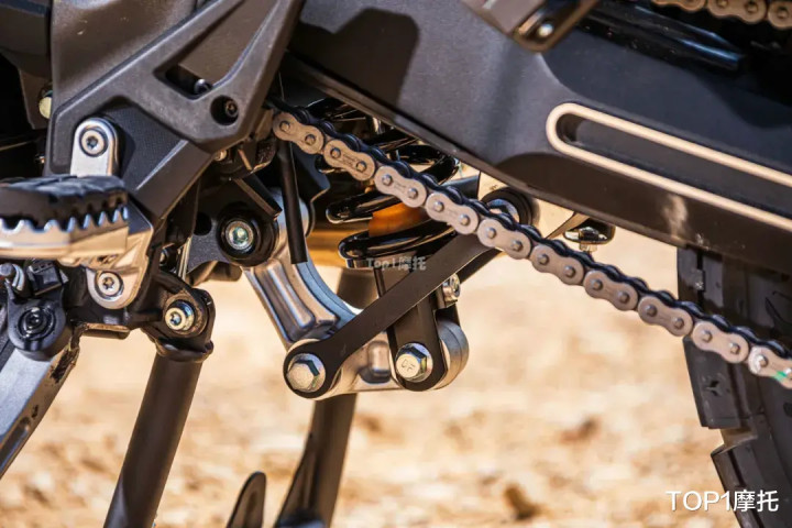 无极DS800X配备了行程为200mm的43mm KYB倒置式前叉;行程为190mm的后KYB多连杆中置后减震(支持预载和阻尼可调),而且后减震还有不需要借助工具的手动调节器,方便野外骑行时随时调整。